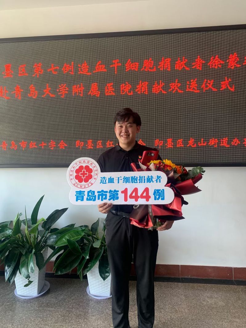 2021年5月,即将大四毕业的他在老家即墨区献血的时候了解到捐献造血干细胞的事情,义无反顾的加入了中华骨髓库,成为了一名造血干细胞志愿者。随时准备捐献造血干细胞去挽救血液病人的生命。2022年5月,即墨区红十字会电话通知其造血干细胞与患者初配成功,他毫不犹豫同意捐献,并积极配合红十字会,顺利完成了高分辨和捐献前体检等流程。