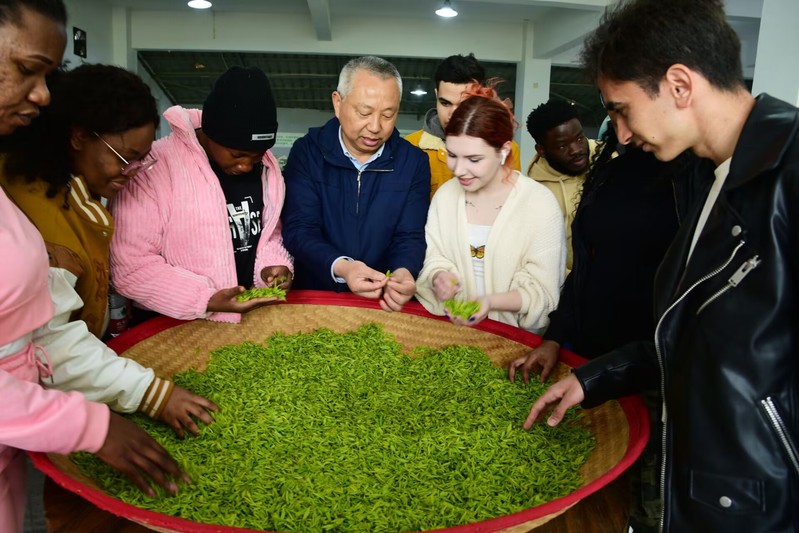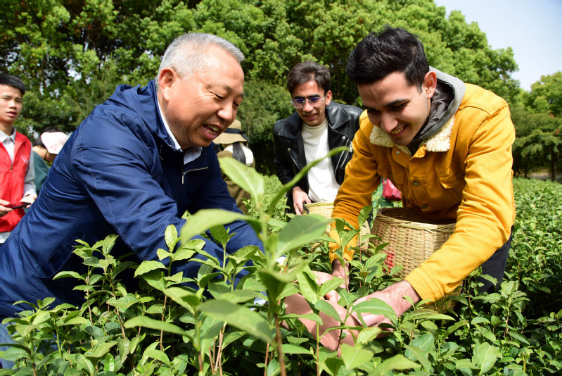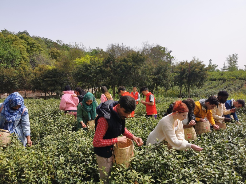 来自摩洛哥、巴基斯坦、孟加拉国、土库曼斯坦、乌克兰等国家的留学生们和中国学生一起腰系茶篓在茶垄间接受着茶艺师的细心指导,学习采摘春茶,了解茶树的生长过程和茶叶制作工艺,在茶园大课堂里开心体验茶文化,增长新见识。他们跨越文化交流的障碍,探讨采茶的经验,交流不同国家的茶文化历史,共同接受茶文化的熏陶,彼此之间增进友谊。