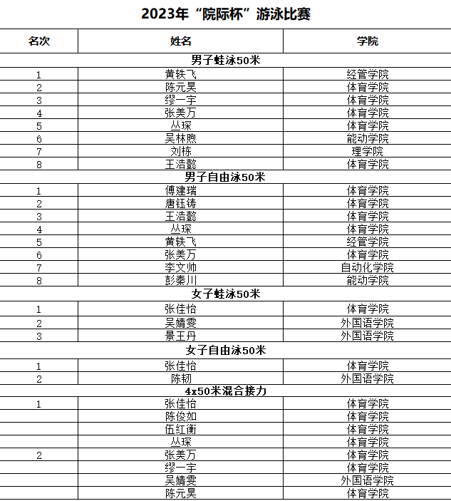 “院际杯”游泳比赛在长山校区游泳池举行。本次比赛汇集了众多来自全校各院系的游泳爱好者,共设置了男子50米蛙泳、女子50米蛙泳、男子50米自由泳、女子50米自由泳、4x50米混合接力五个项目,这也是长山校区游泳池举办的第一次正式比赛。