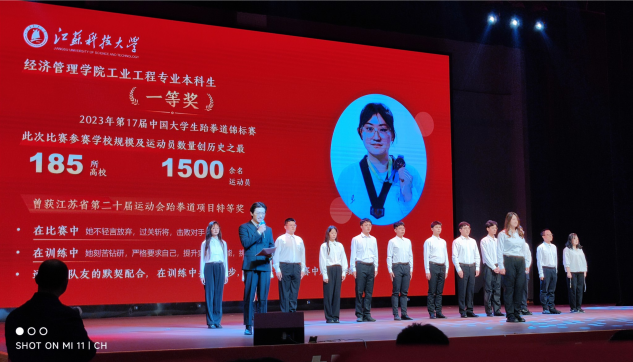 白蕾琪同学从学前班就参加跆拳道学习,开始学习是父母推荐的,之后学习过程中逐渐真正热爱上了跆拳道,且一直坚持不懈地训练。大学刚入学就积极加入了跆拳道社团,利用空余时间坚持社团组织的训练,经过一段时间的训练,通过选拔成为了一名校跆拳道队正式队员,先后参加了江苏省第二十届运动会高校部跆拳道比赛,获得甲A组女子+72kg铜牌;2023年第17届中国大学生跆拳道锦标赛,获得了甲组女子+73kg第五名。
