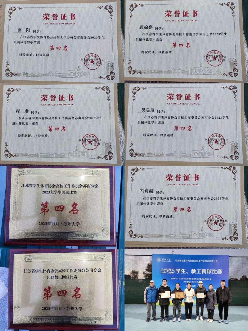 在教练员的指导下,学校网球队常年保持系统化、科学化的训练。通过队员们的不懈努力和刻苦训练使得队伍不断成熟,成为一支重点运动队,同时也取得了一系列好成绩。2005 年获“玛麒杯”第十届全国大学生网球锦标赛男子单打第3名。2015年全国大学生网球联赛(华东区)男子甲组团体第5名、男子丙组第7名。2016年江苏省高校网球单项赛男子甲组第1、3名。2017年全国大学生网球联赛(华东区)男子丙组团体第4名。2019年江苏省苏南分会网球比赛团体第5名。2022年江苏省第20届省运会(高校部)网球比赛男子团体第七名;男子双打第五名。2023年第2届中国大学生网球线上赛个人二等奖2项;个人三等奖4项。2023年11月苏南分会网球比赛团体第4名。