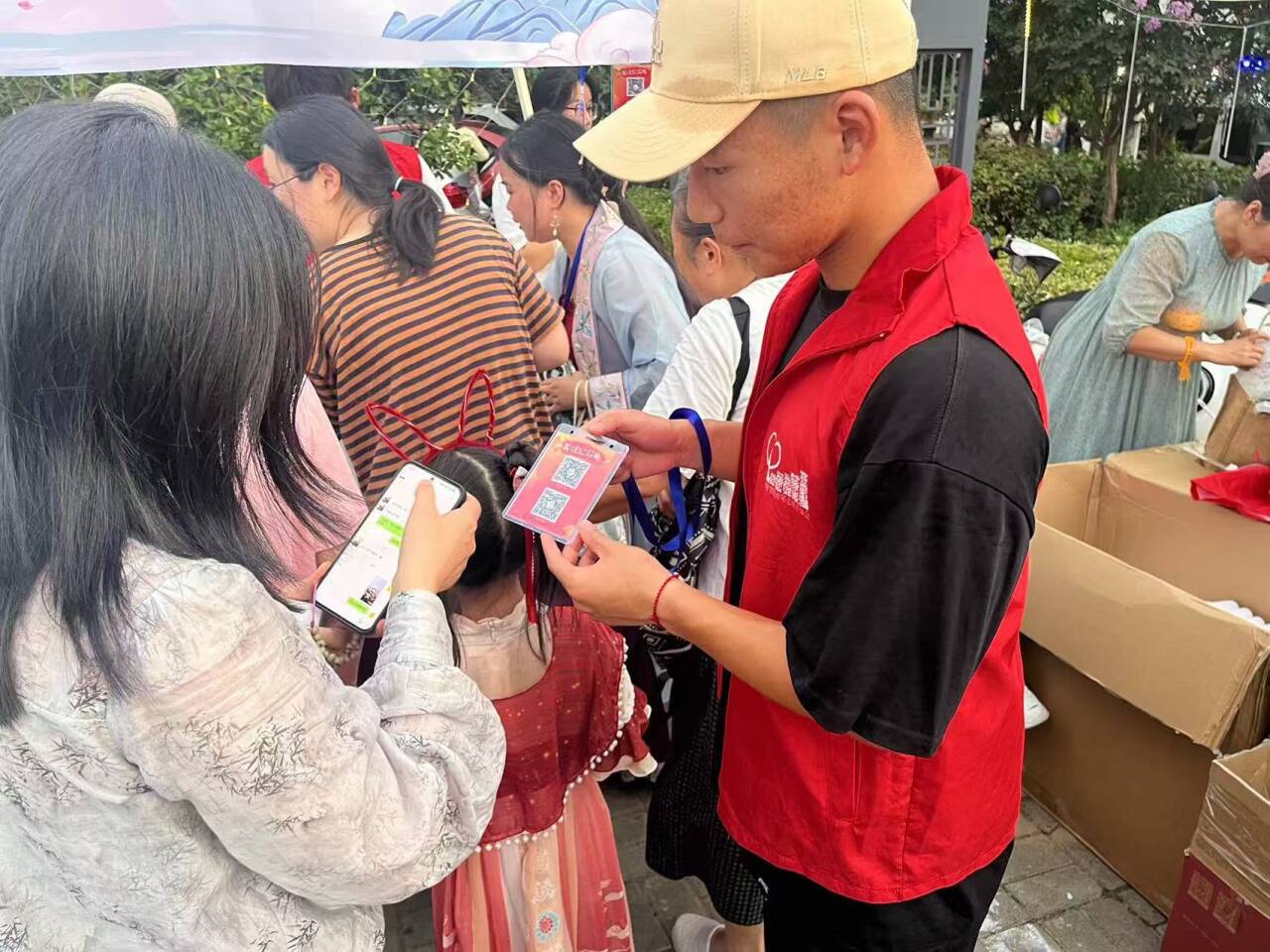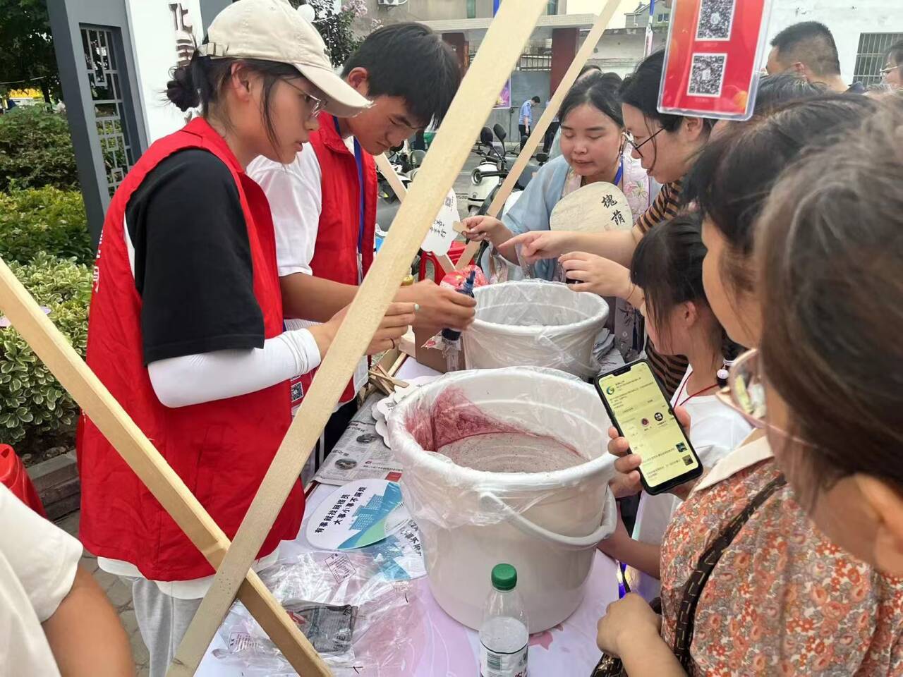 实践团成员提前做好分组,一组成员引导行人,维护现场安全;一组成员在非遗集市为参加活动的人们制作非遗文化遗产漆扇,并介绍相关的历史文化,让更多的人近距离感受非遗的魅力,促进中华传统文化的传承;还有一组成员在现场宣传践行‘零彩礼、低彩礼’理念,引导社会形成健康向上的婚姻观念。
