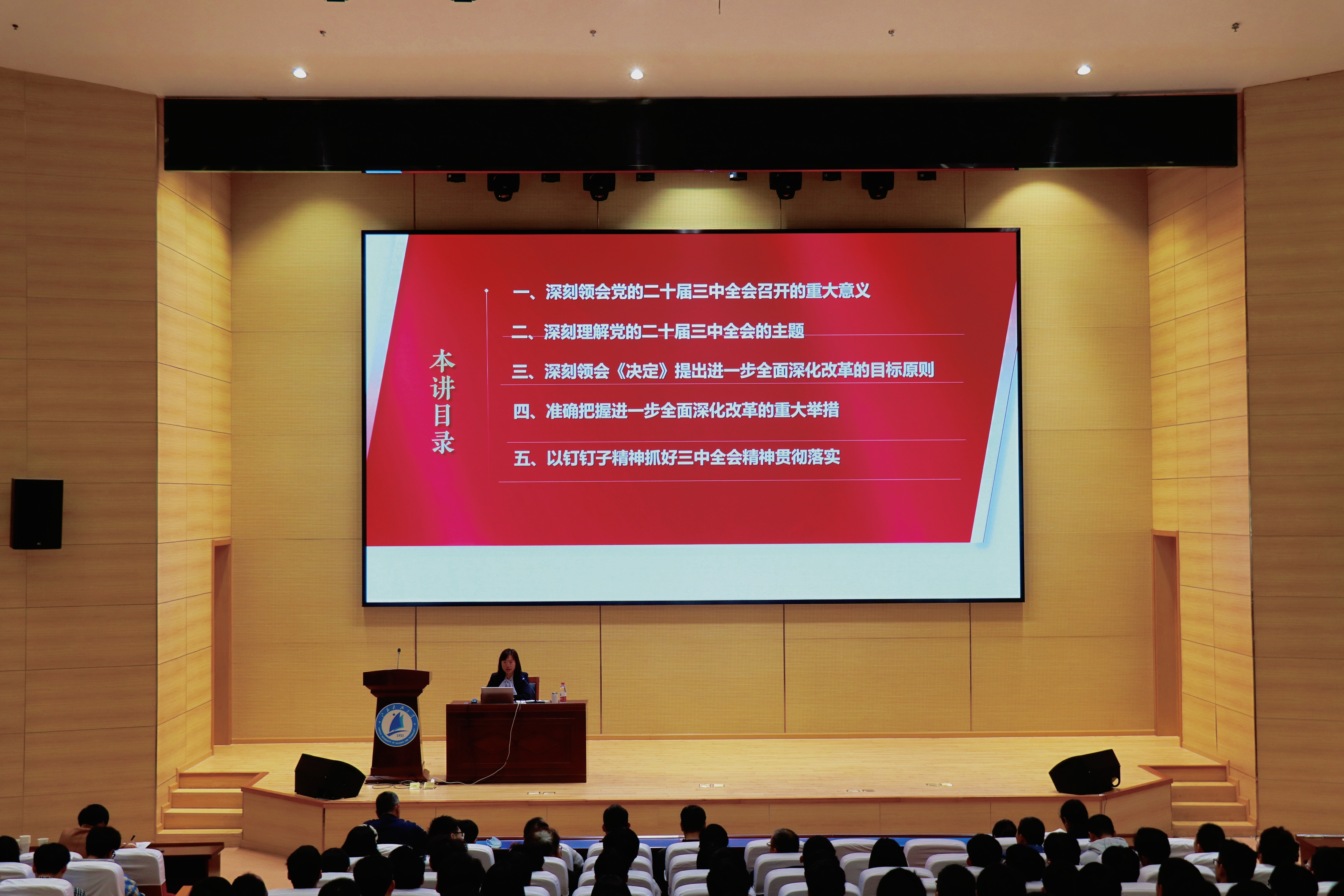 周春燕部长以《进一步全面深化改革,共绘中国式现代化新蓝图》为主题,分别从深刻领会党的二十届三中全会召开的重大意义、深刻理解党的二十届三中全会的主题、深刻领会《决定》提出进一步全面深化改革的目标原则、准确把握进一步全面深化改革的重大举措、以钉钉子精神抓好党的二十届三中全会精神贯彻落实等五个方面,全面阐释了党的二十届三中全会精神。