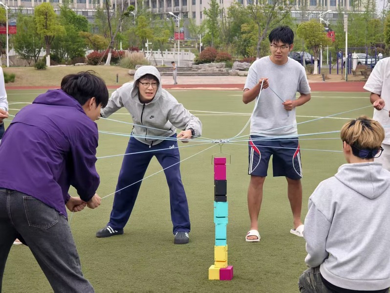 活动以“破冰三部”曲拉开序幕。伴随轻快的音乐,学生们围成同心圆跳起热身舞蹈,笑声与节奏交织,迅速消融初见的拘谨。“花开花落”集体拉伸环节,大家通过肢体协作模拟花朵盛放与收拢,感受彼此呼吸的同步;“团队解手链”挑战中,32人双手交错相握,通过沟通与协调将错综复杂的“人链”还原为完整圆圈。“原本陌生的面孔,在解手链时突然有了默契。”2023级学生陈冠宇感慨,“原来只需一个契机,团队就能拧成一股绳”。