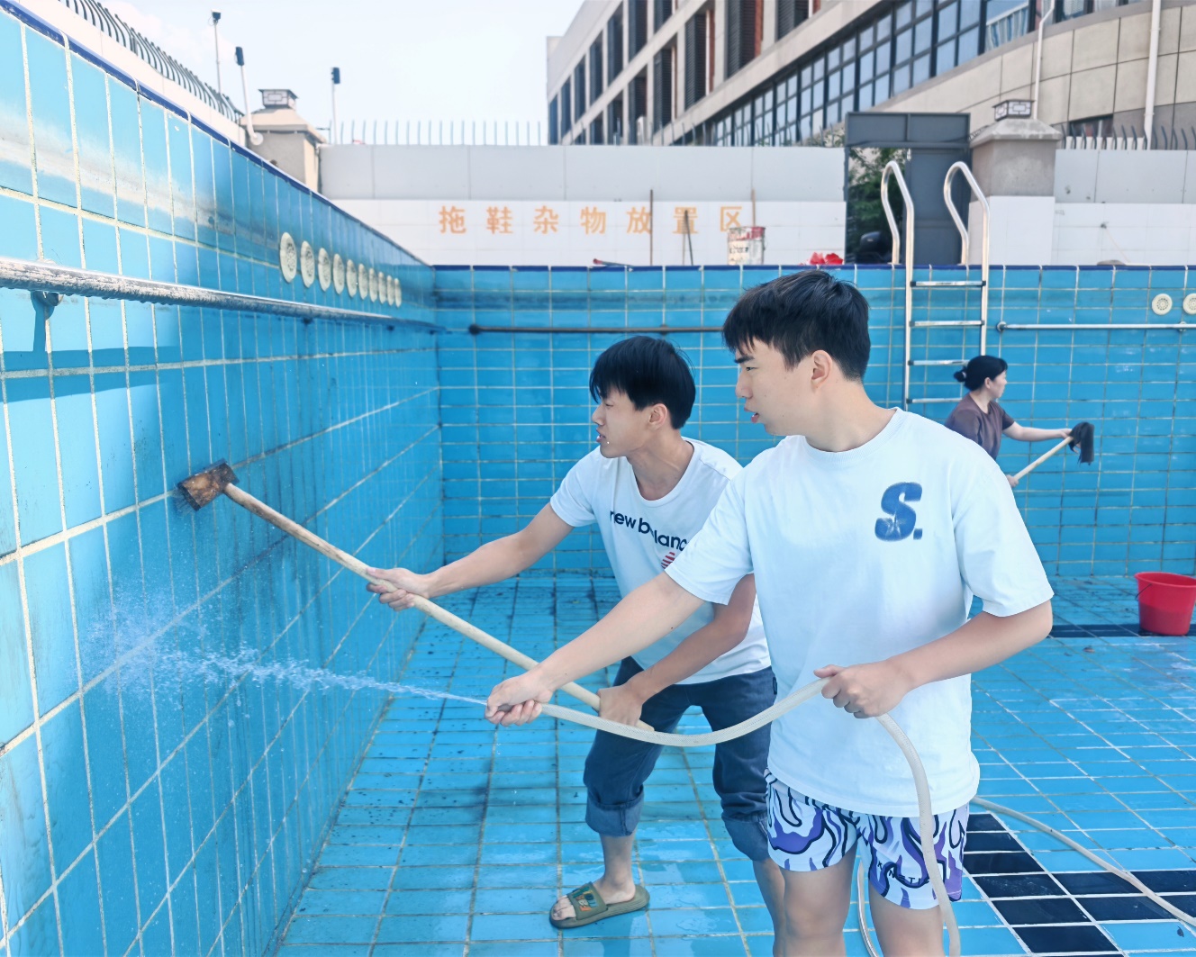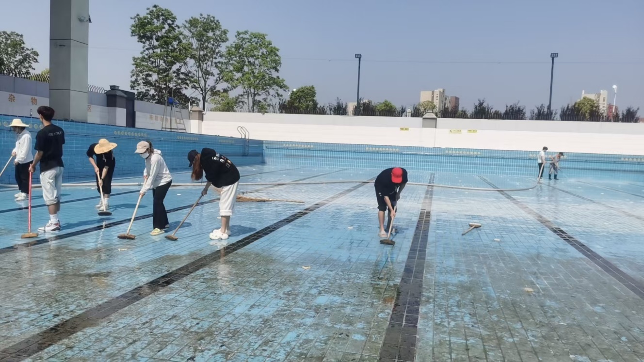 活动现场,参与劳动的同学们分工明确、热情高涨。预备党员们充分发挥先锋模范作用,带头进入游泳池,不怕脏、不怕累,手持扫帚、刷子等工具,认真清理池底的泥沙、落叶等杂物,仔细刷洗池壁上的青苔和污垢。学生劳动积极分子们也不甘示弱,积极配合,共同完成各项清理任务。大家齐心协力、默契配合,展现出良好的团队协作精神。经过数小时的辛勤劳动,游泳池池底和池壁焕然一新,为后续游泳教学和群体活动提供了有力保障。