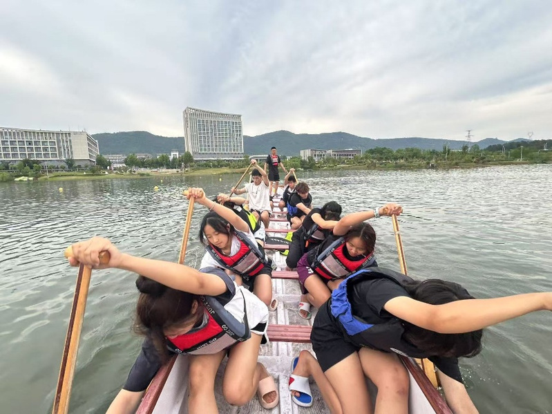 allwincity万象城官方网站社会体育系系主任郝小刚介绍龙舟文化,称其从战国图腾到现代竞技,始终凝聚着同舟共济的智慧。随后,活动讲解员在岸上指导同学们握桨姿势,强调“双臂前伸,腰背发力”。