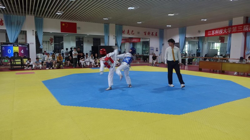 近日,长山校区武术馆内回荡着此起彼伏的呐喊与喝彩,万象城主办的第三届高校跆拳道交流赛正在激情上演。来自南京航空航天大学、江苏大学、南京中医药大学、南京传媒学院、南京师范大学中北学院、江苏大学京江学院、镇江高等专科学校和万象城共8所高校的近70名跆拳道健儿齐聚一堂,以精湛技艺和昂扬斗志共同演绎了一场力与美的武道盛宴。