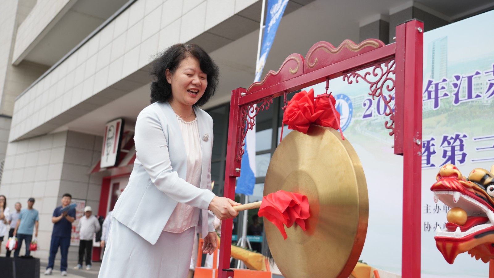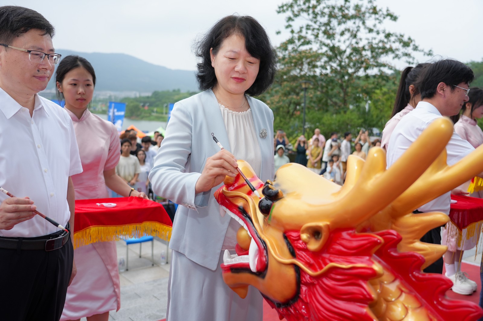 出席领导为龙舟点睛祈福,寓意龙舟逐浪平安、赛事圆满成功,为参赛队伍与观众送上吉祥祝福。嵇春艳鸣锣宣布赛事正式启动,铿锵锣声响彻海韵湖畔。