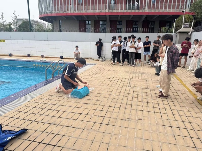 实操演示环节更是将活动推向了高潮。在游泳馆内,专业讲师现场演示了“叫-伸-抛”救援法、心肺复苏(CPR)及人工呼吸等关键自救互救技能。学生们在讲师的指导下,亲身体验了救生衣的科学穿戴、应急哨的使用规范以及救生杆的操作训练。这种“手把手”的教学方式,让学生们在实际操作中掌握了自救互救的技能,提高了应急处理能力。